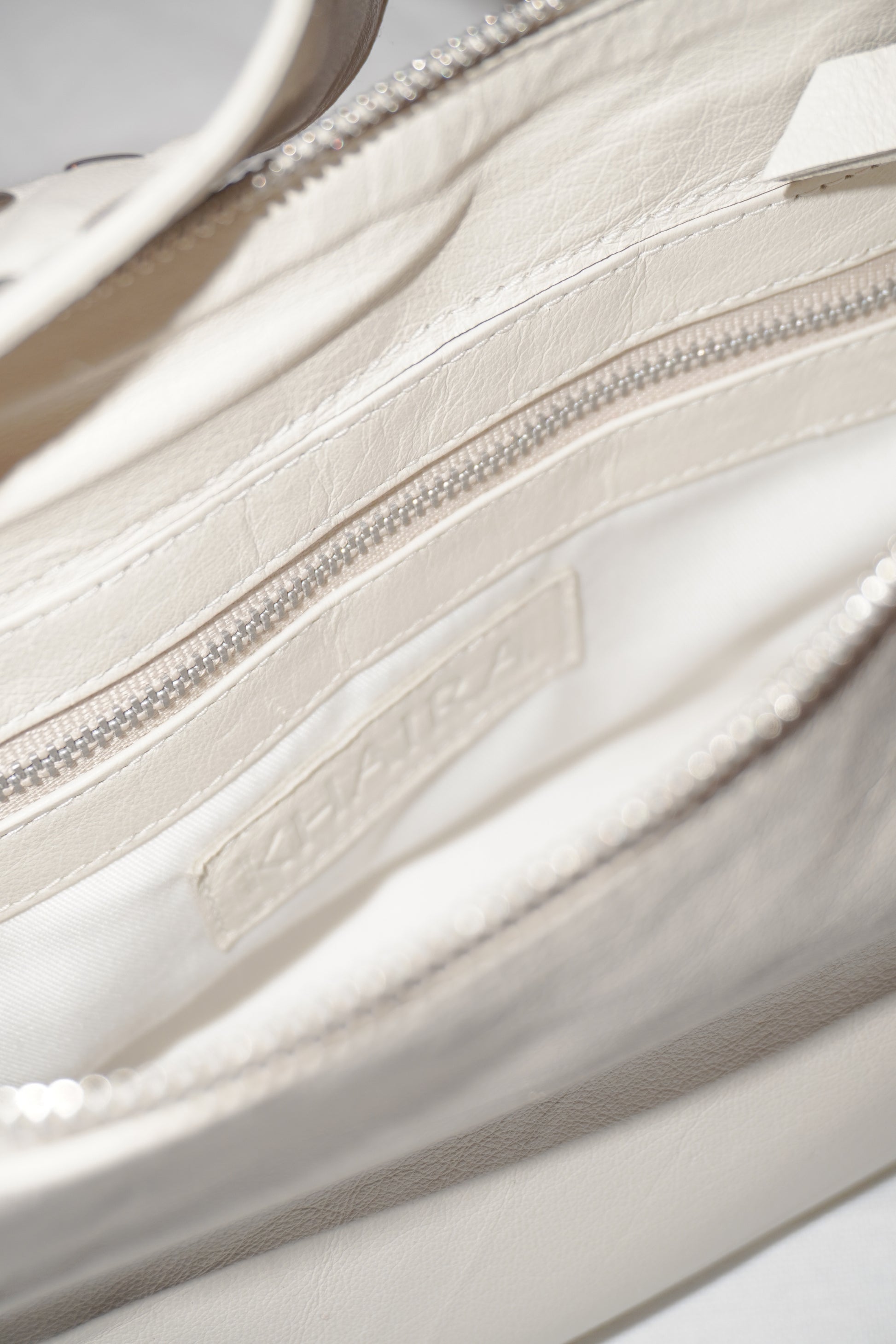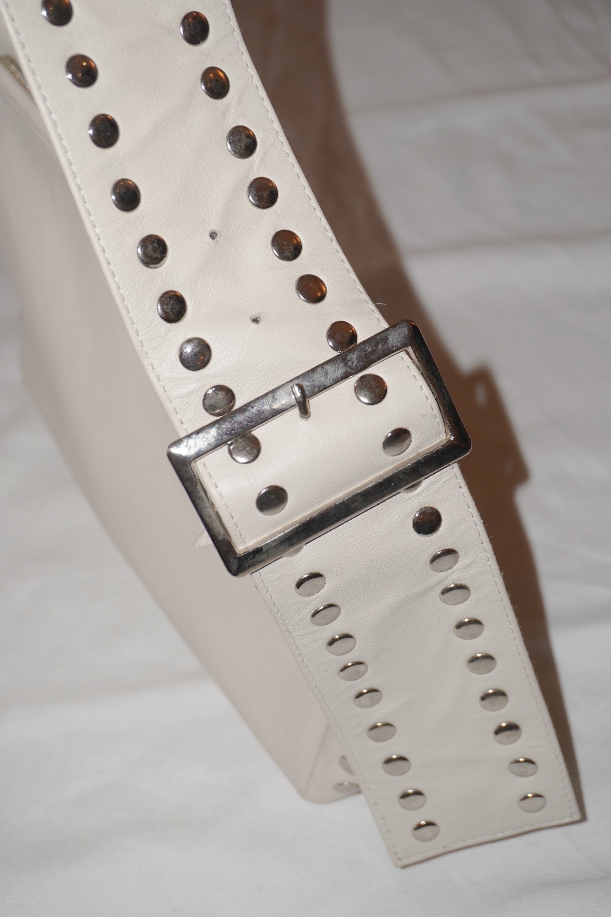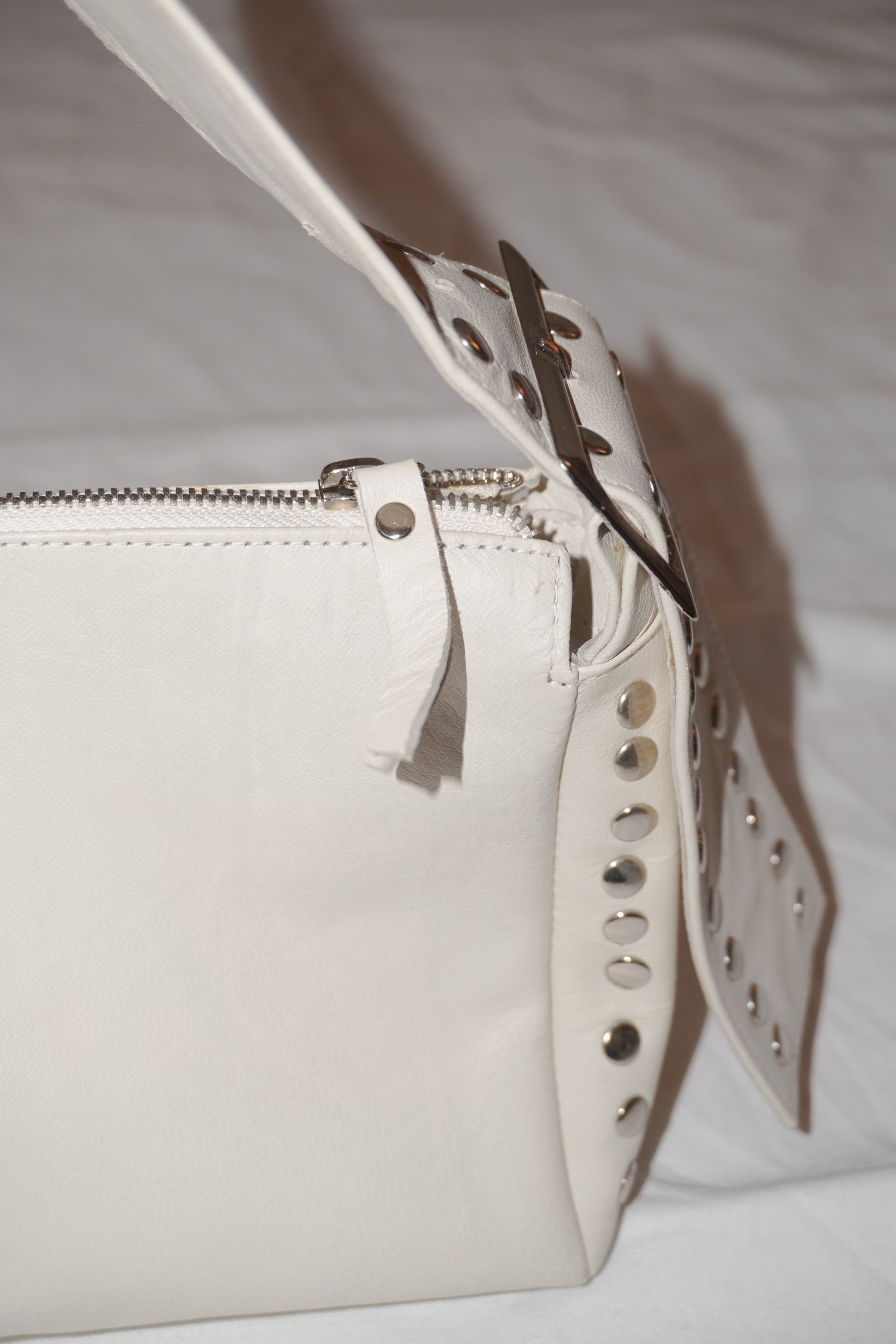Off white / beige sample. Stiff leather with Buckle feature on strap.